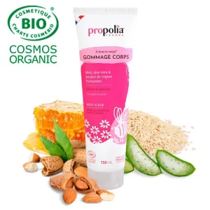 Le gommage corps Bio (150 ml) onctueux exfolie en douceur grâce au miel, à la poudre de riz et de coques d’amandes upcyclées.